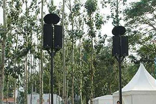 将中音扬声器和高音扬声器吊装或高架在有一定高度的位置,这样声源会通过空间直接送入到露天声场的后部分区域,从而减少了声功能的损耗。如此只要调整好音箱和号角的辐射角度,就会将声场覆盖面积铺得比较均匀。